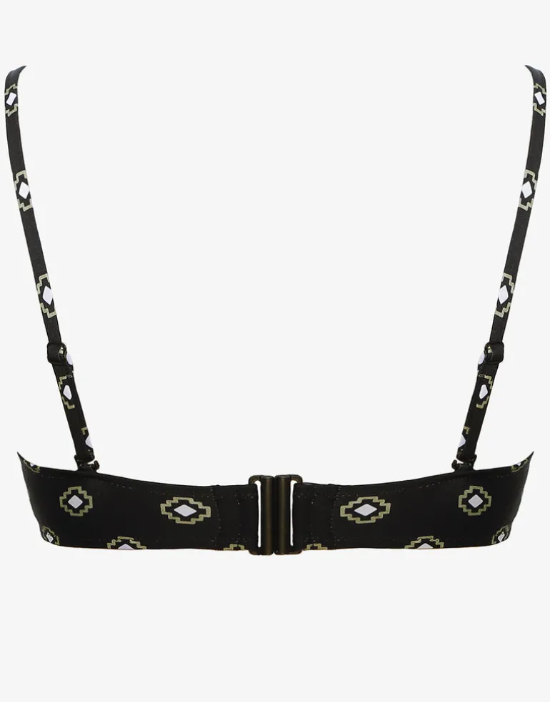 The Tiles Craft Bralette bikini top from Watercult is a tile inspired print in black with white and olive green motifs. This cute bralette style bikini top has narrow adjustable and convertible straps, removable cups and a pretty gold coloured D ring detail at the centre front.