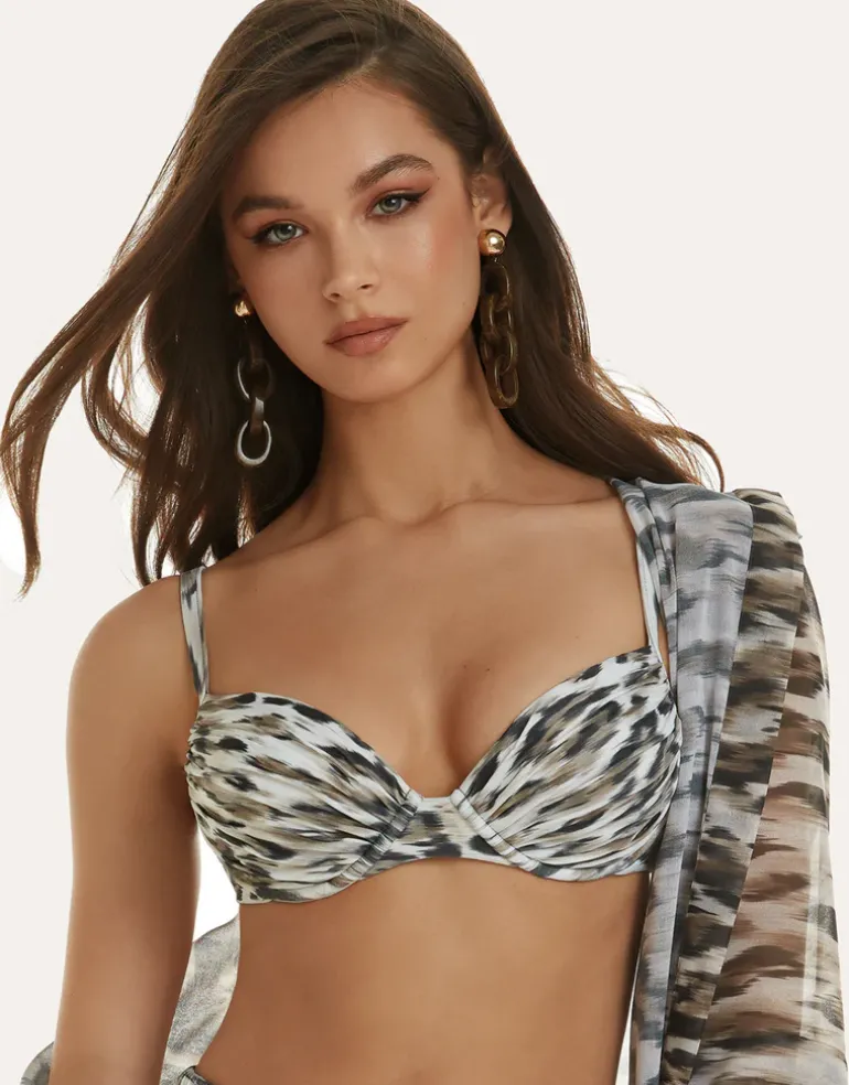The Africa Underwired bikini set from Roidal is a fabulous animal print bikini with a moulded underwired bikini top with gathered cups, adjustable straps and a clip back, paired with a moderate coverage pant with gathered front.