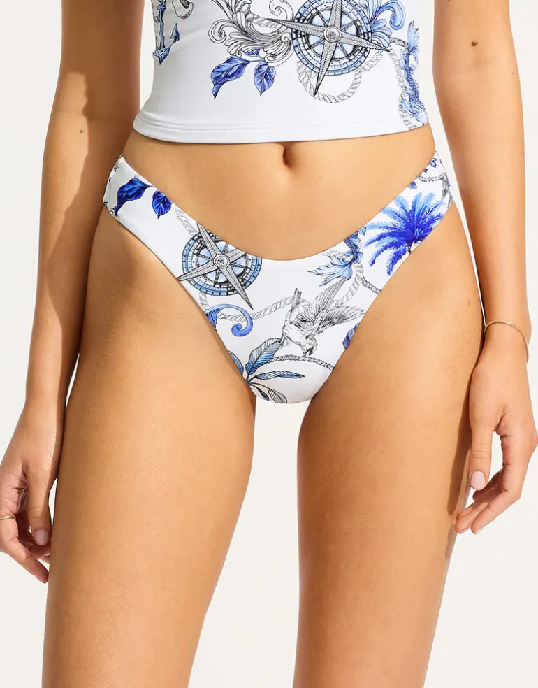 The Ahoy Scoop High Cut Rio Bikini Pant from Seafolly is a low rise, high cut leg bikini pant offering minimal coverage in a Mediterranean inspired white, nautical print.