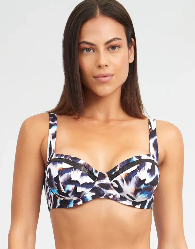 The Alika Balcony bikini top from Nuria Ferrer in a beautiful multicoloured animal print is a supportive, underwired, balcony style bikini with soft moulded cups and adjustable straps.