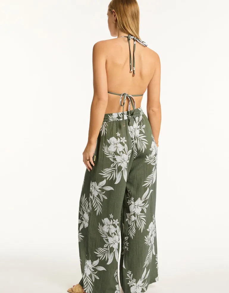 The Aloha Beach pants from Sea Level are wide leg, high waist pants in a cotton gauze with tropical print. Featuring side pockets and an elastic waist with drawstring cord.