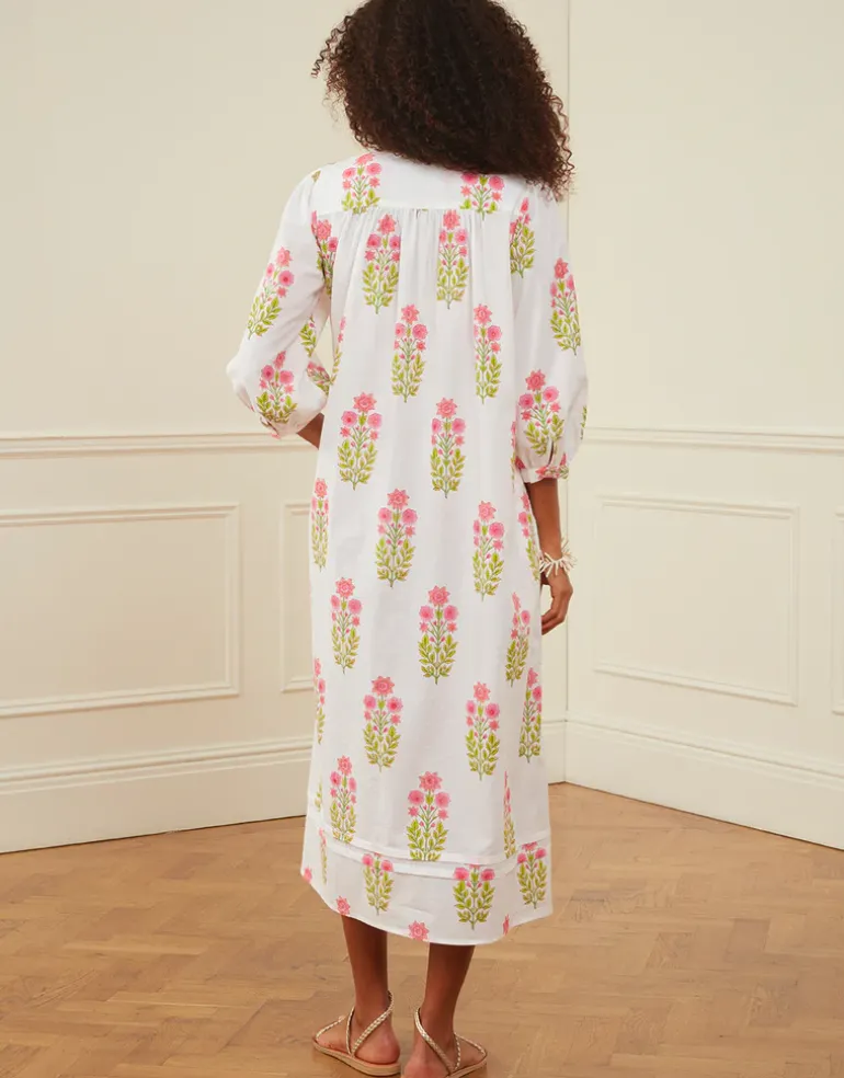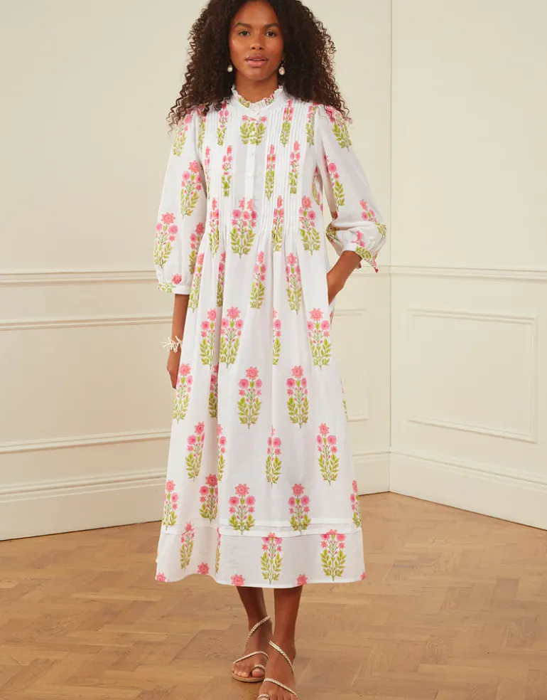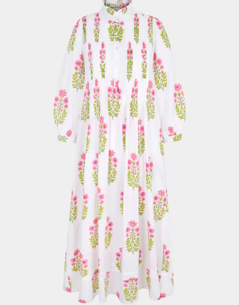 The Anjuna kaftan from Pink City Prints is a shirt-style kaftan featuring a high neck with a charming frilled collar and a button-down neckline for adjustable comfort. Vertical pleats over the bust add texture and interest to the garment. With its vibrant zest green and pink botanical print on a bright white background, it exudes a fresh and summery vibe.