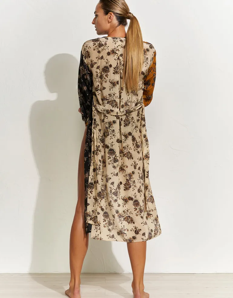The Antagonist Kimono from Maryan Mehlhorn is a beautiful caramel, black and cream floral style long kimono made of fine silk in a patchwork look. With long sleeves and a sash tie belt.