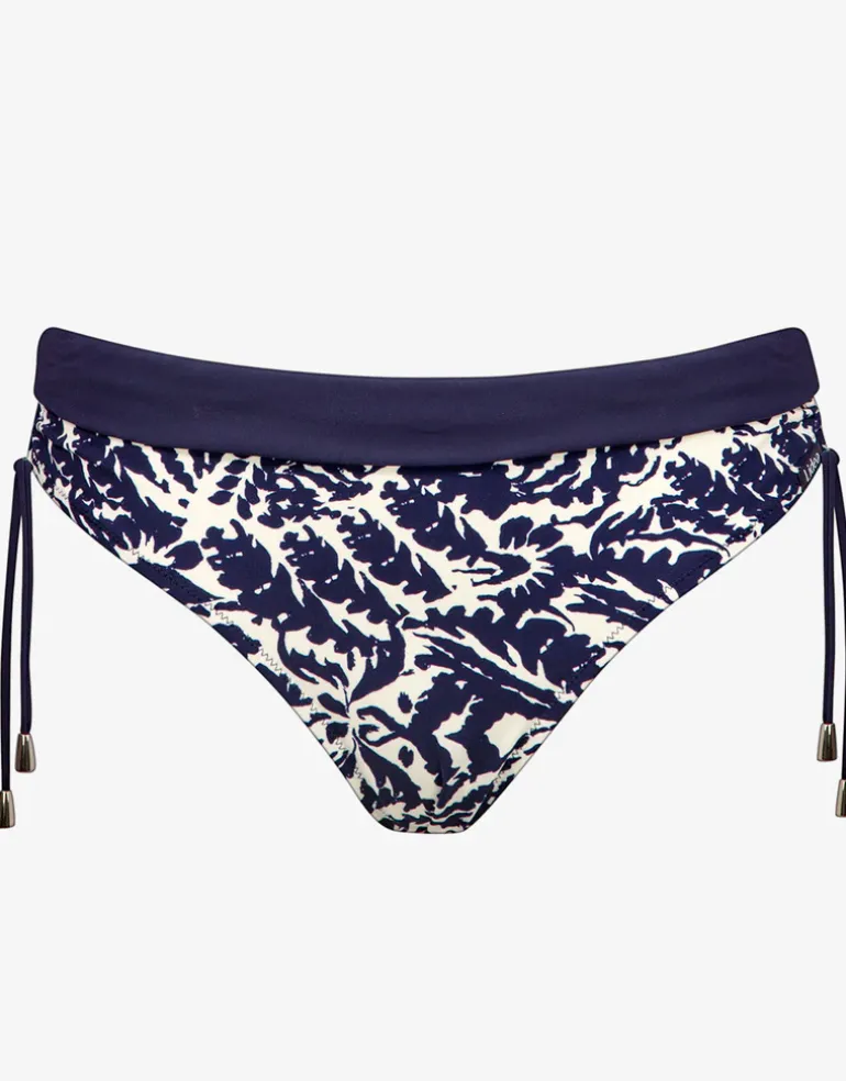 The Arabesque Mood Adjustable Bikini Pant from Lidea in a beautiful ornamental monochrome print of blue and white, features a banded waist and ties to cinch and adjust the leg height finished with metallic silver beads.