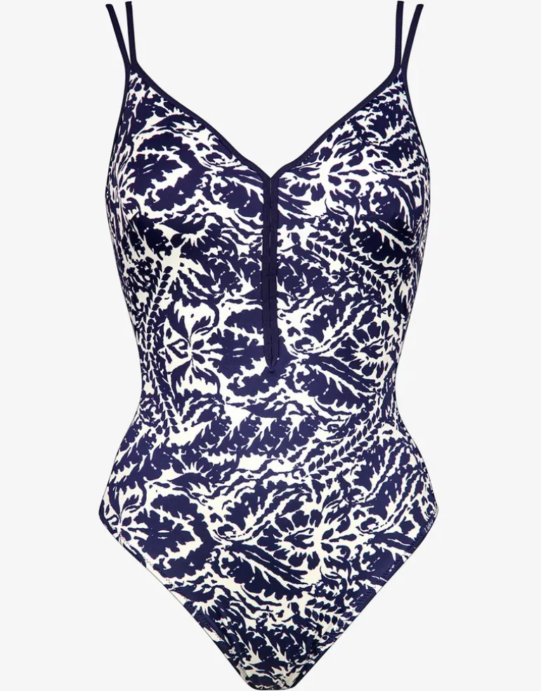 The Arabesque Mood Underwired Swimsuit from Lidea is an extra support, underwired swimsuit in an ornamental monochrome print of blue and canvas white. The v-neck style and thin blue panel on the front draws the eye, while the adjustable, twin straps add elegance.