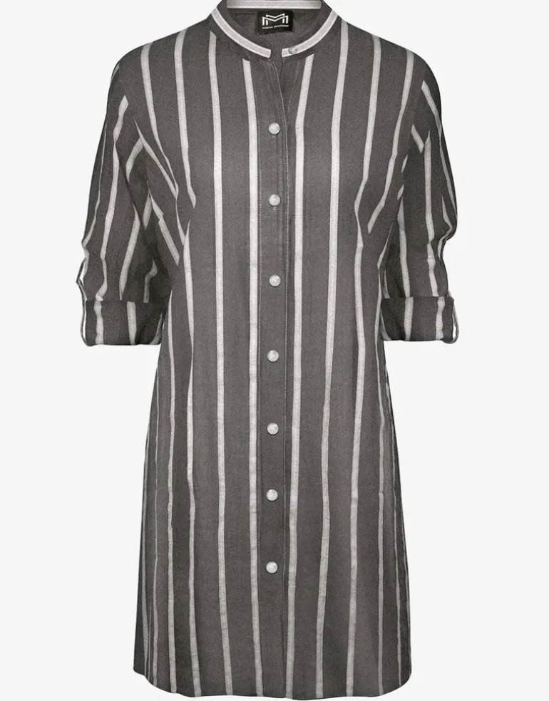 The Argentum Beach Shirt from Maryan Mehlhorn is a stylish zinc grey and white striped, smart beach shirt with a button front, roll up sleeves and a mandarin collar.