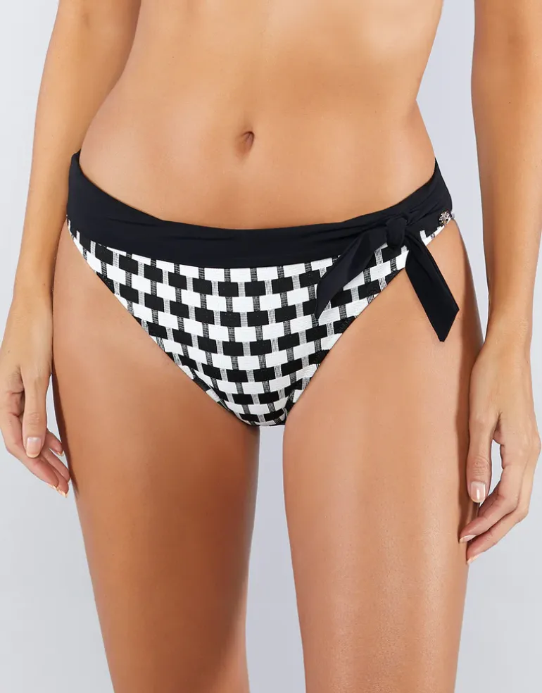 Matching the Audrey bandeau bikini top from Nuria Ferrer, this classic bikini pant has good coverage and a wide folded band at the waist with tie to one side.
