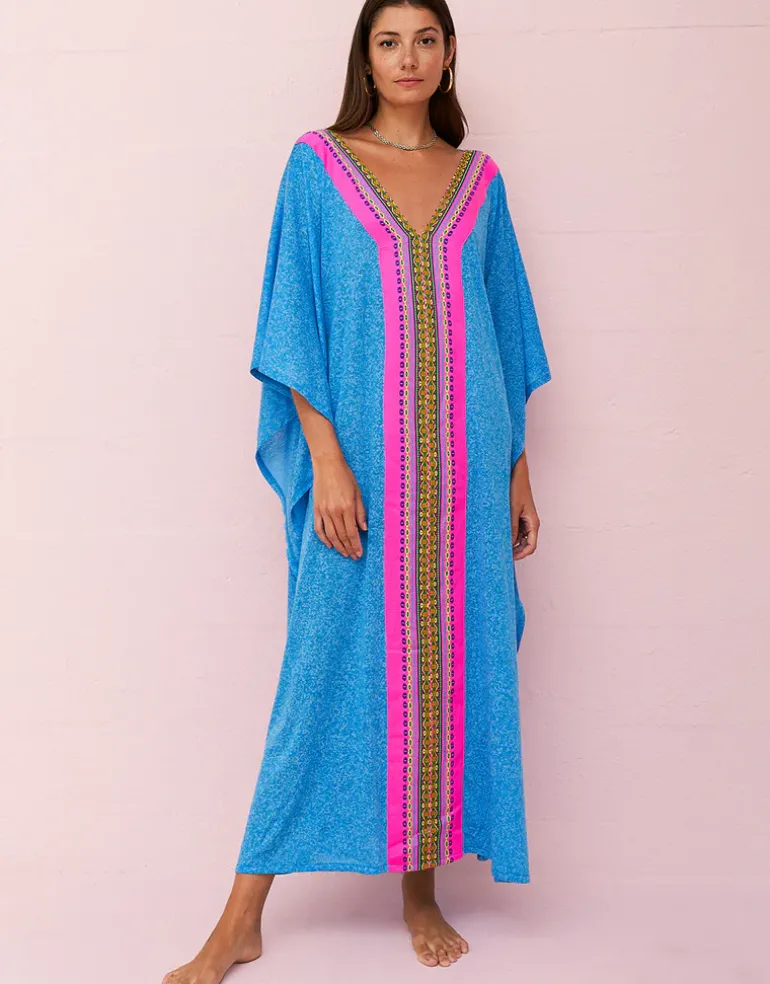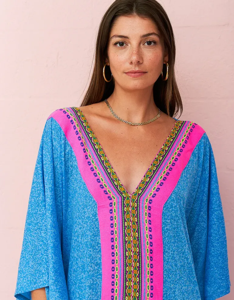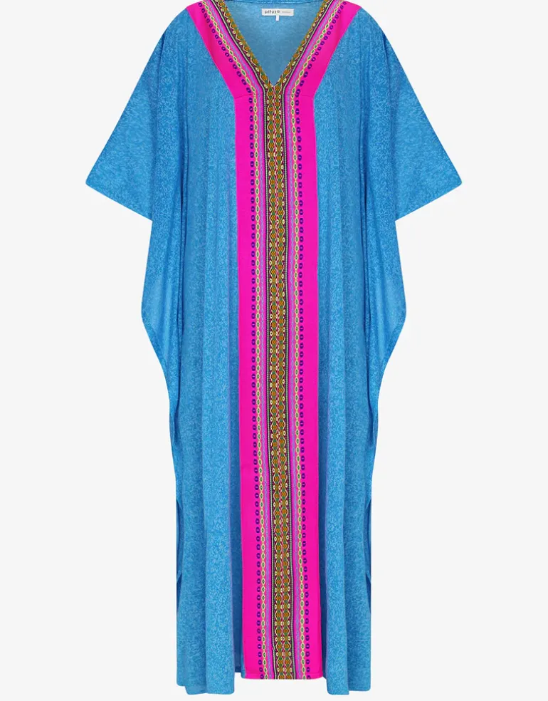 The beautiful bright blue Aurora Thobe from Pitusa features a flattering deep v-neckline and loose sleeves and is decorated with bright link Inca trim at the neckline and front. Available in Standard or Petite lengths. Choose Standard if you’re over 5ft 4in and Petite if you’re under.