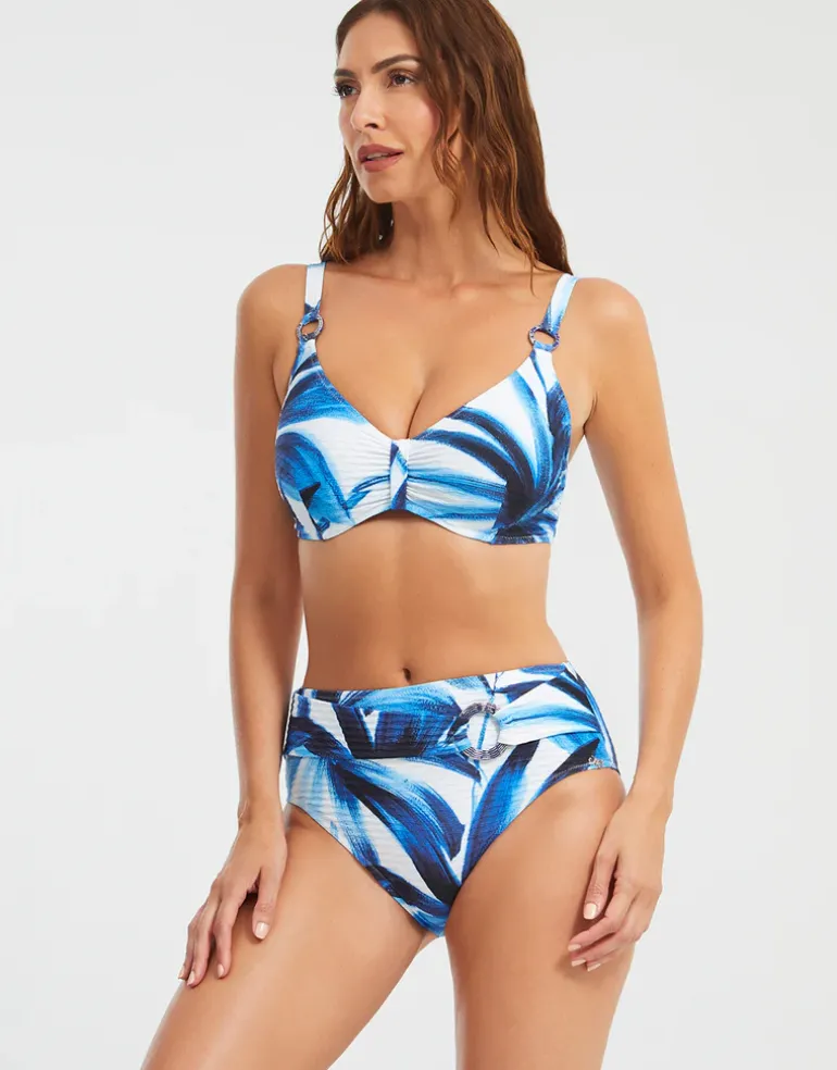 The Azura Underwired bikini top from Nuria Ferrer is a supportive, underwired style with adjustable straps made from a beautiful blue and white textured fabric. Ring detailing at the shoulders and a gathering with a decorative tab at the centre add interesting detail.