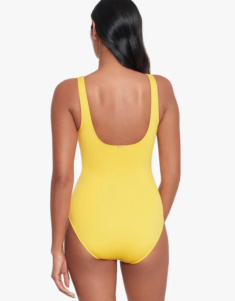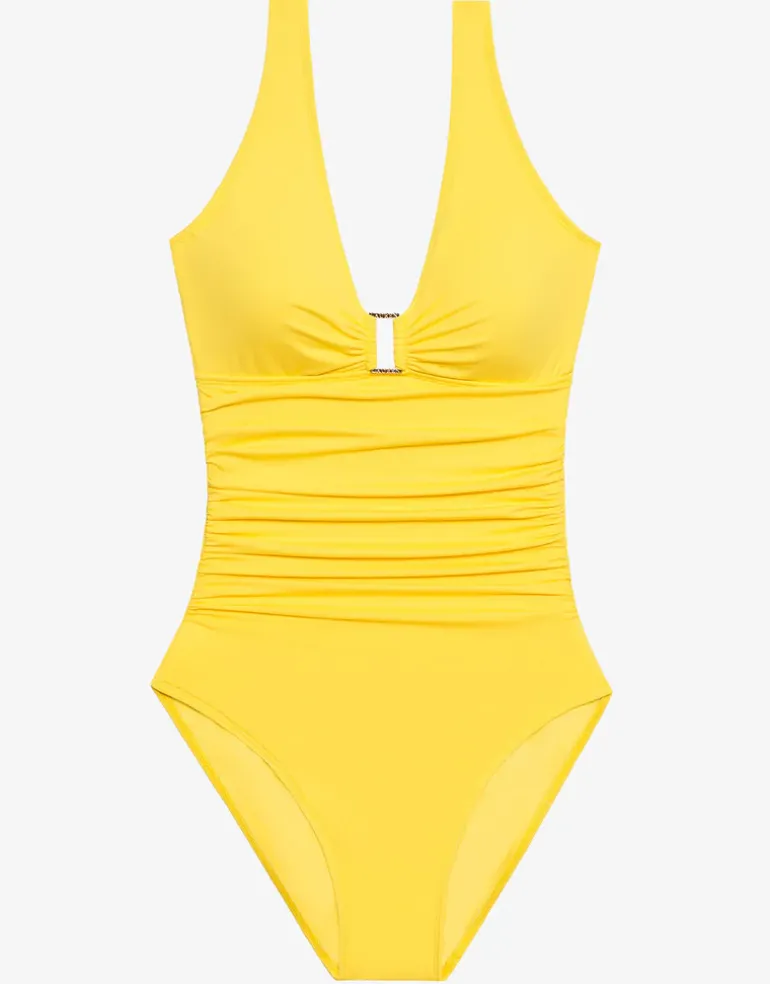 This lovely yellow Ring Front swimsuit from Lauren Ralph Lauren’s Beach Club Solids collection is a great underwired, plunge front style with wide straps and a branded metallic square ring detail at the front. With removable cups, comfortable wide straps and a high scooped back.