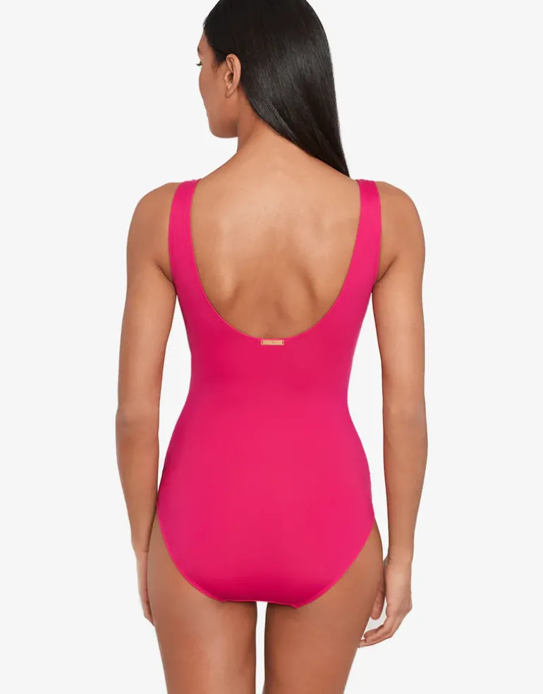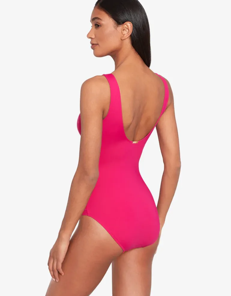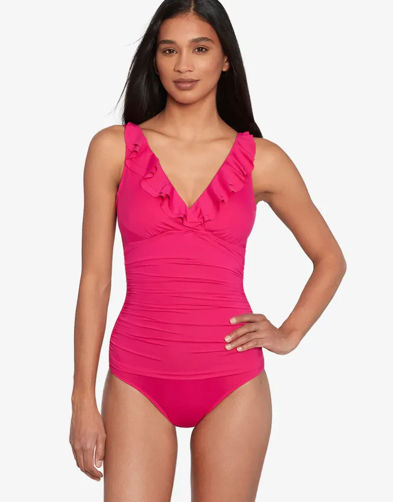 The Beach Club Solids Ruffle swimsuit from Lauren Ralph Lauren is a flattering V neck style with a pretty double ruffle border neckline. With underwired cups and removable padding and a slimming fit.
