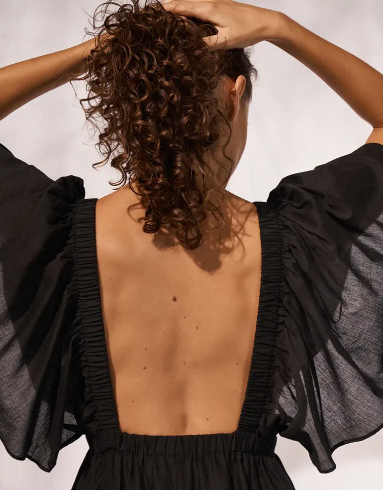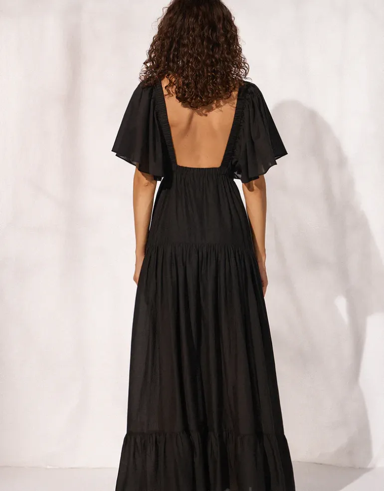 The Beach dress from Watercult in a chic, sheer black fabric is a stunning tiered maxi dress featuring a band under the bust, a deep plunge neckline, and a low square back. The elegant floaty, butterfly sleeves add a touch of sophistication, creating a perfect beach-to-evening look.