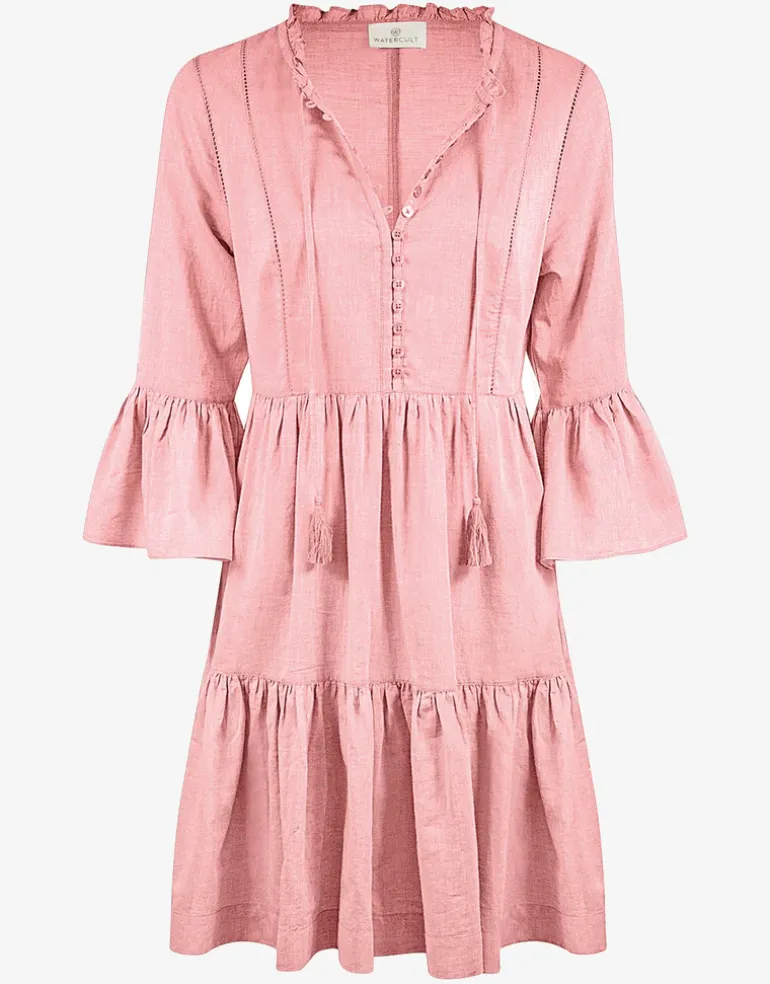 This pretty Chalky Pink dress from Watercult has a tiered skirt, wide flounce sleeves, buttons to the waist and tasselled ties at the neck.