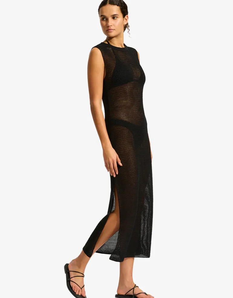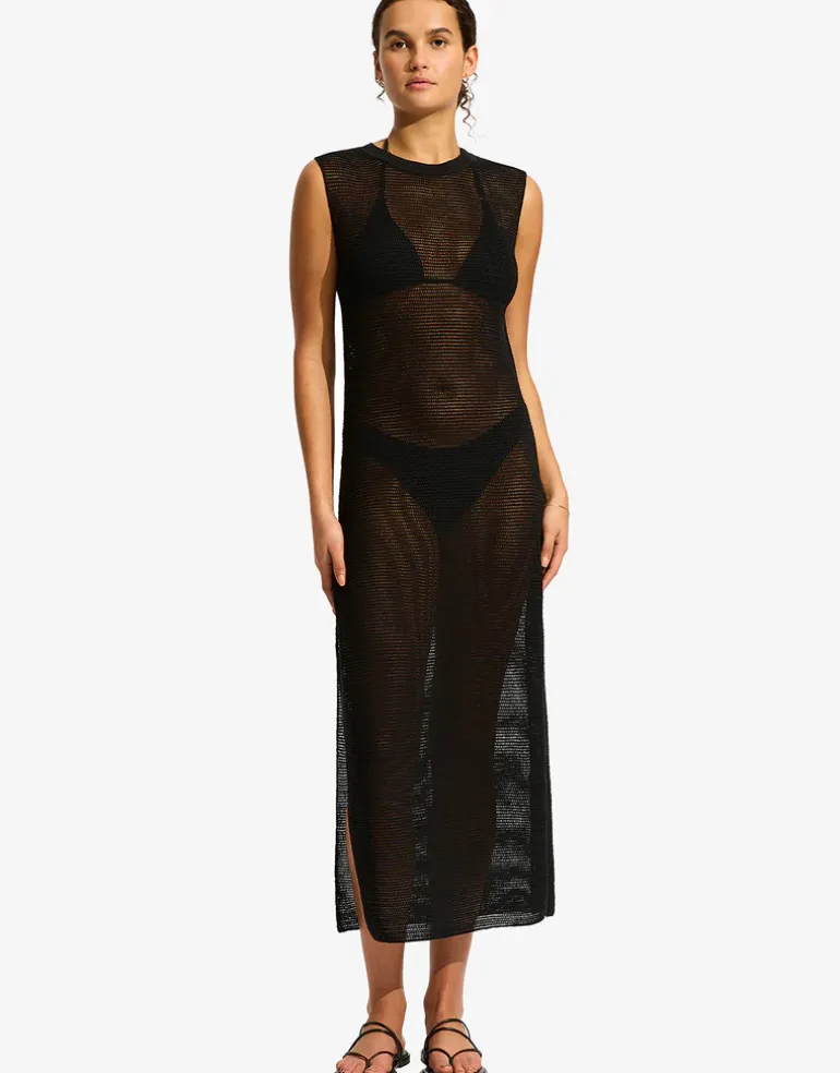 The Beach Edit Maxi Knit dress from Seafolly is a maxi length, mesh dress with a high crew neckline, dropped armholes and side splits. Perfect for covering up on the beach.