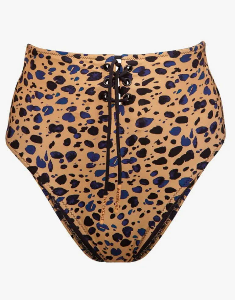 The Beach Pebbles High Waist bikini pant from Watercult is a great pant for tummy coverage. High cut on the leg as well as high at the waist and with eyelet and laced detail at the front.