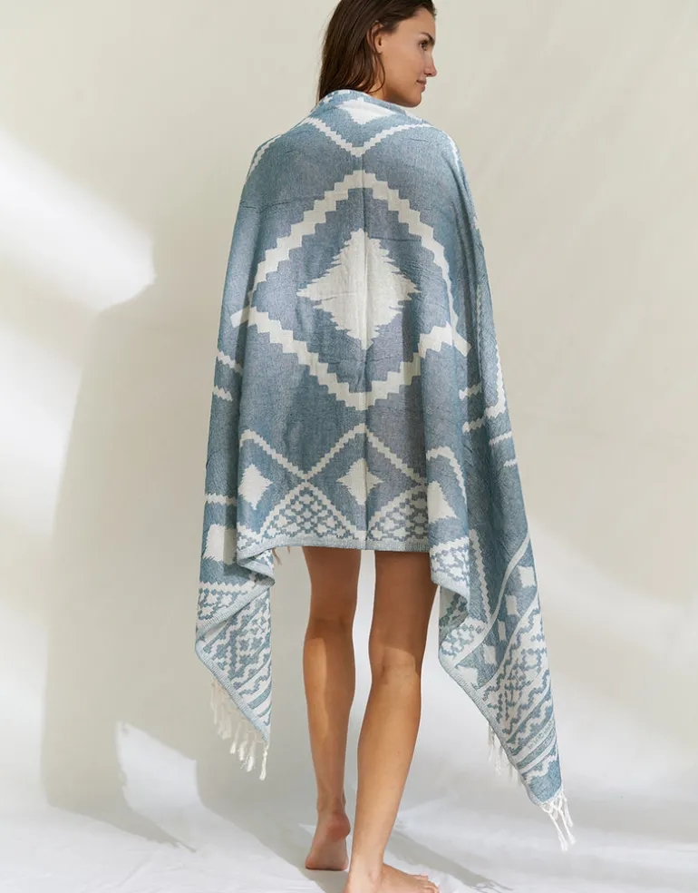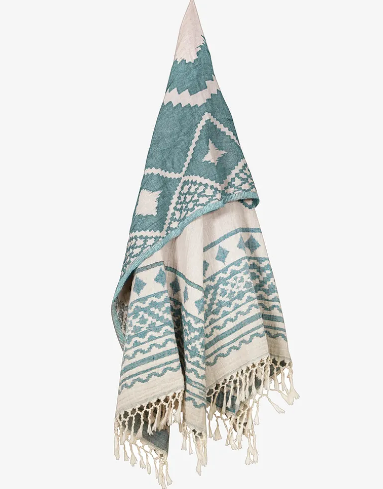 The Seaside Blue Beach towel from Watercult is a lovely blue and white Aztec design towel with a tasseled hem.