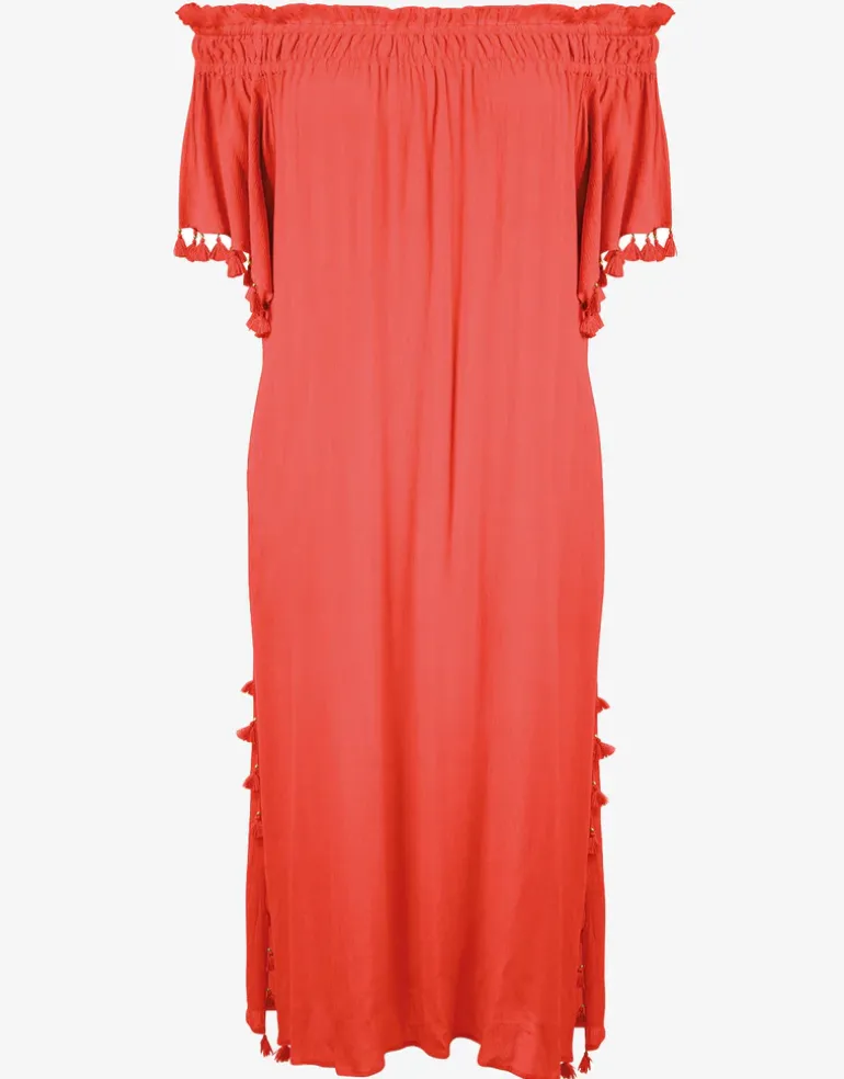 This new style Off the Shoulder dress from Watercult is a calf-length off-the-shoulder style with tassels on the sleeves as well as side splits.