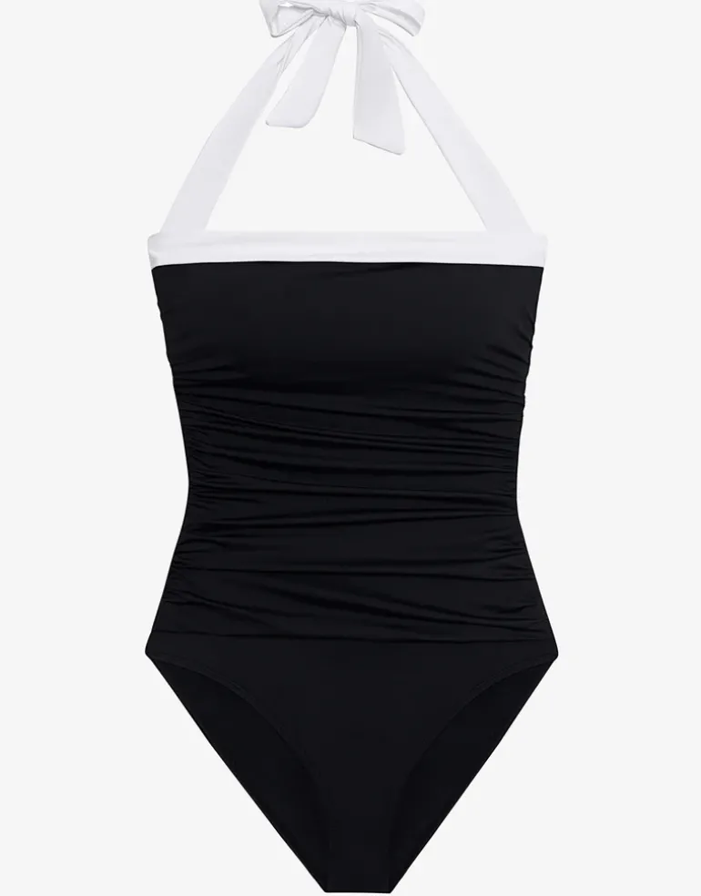 The Bel Air Shirred Bandeau Mio swimsuit from Lauren Ralph Lauren is a lovely black one-piece with a wide contrasting white band at the neckline and wide straps that tie at the neck. With sewn-in cups, ruching across the waist and a slimming fit for tummy control, this is a classic look swimsuit.