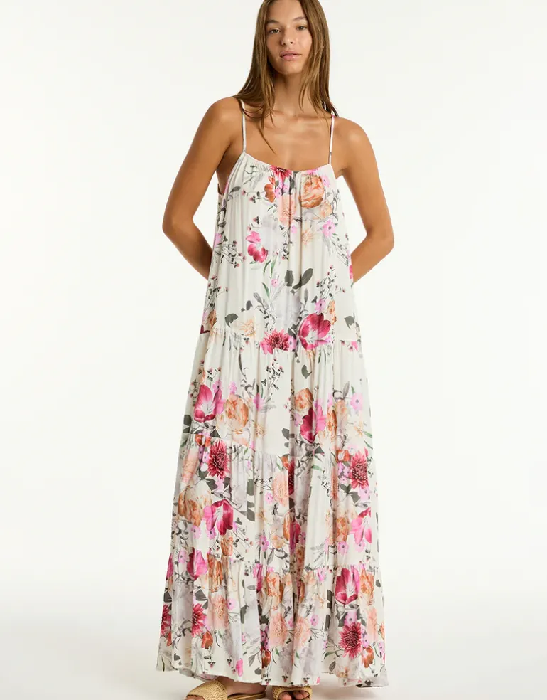 The Belle Tiered Maxi sundress from Sea Level in a delicate watercolour palette of romantic florals on a white base is a lovely maxi dress with multiple tiers. Featuring adjustable straps for a great fit, a low scooping back with an elegant tie and side seam pockets.