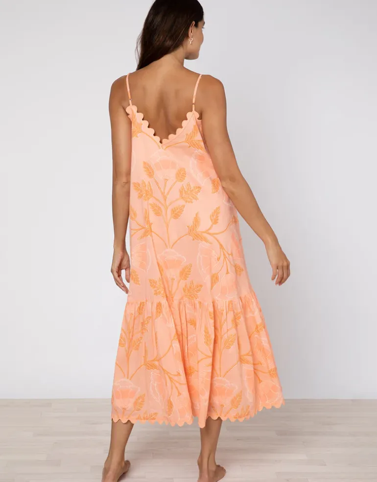 The Bellflower V Neck Midi dress from Juliet Dunn is a pretty midi-length summer dress in soft peach cotton with hand-printed trailing floral design. The deep V at both the front and back falls down the body and flows as you move. A loose silhouette, this flattering, throw-on shape has adjustable straps to ensure the best fit.