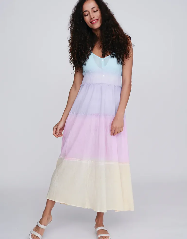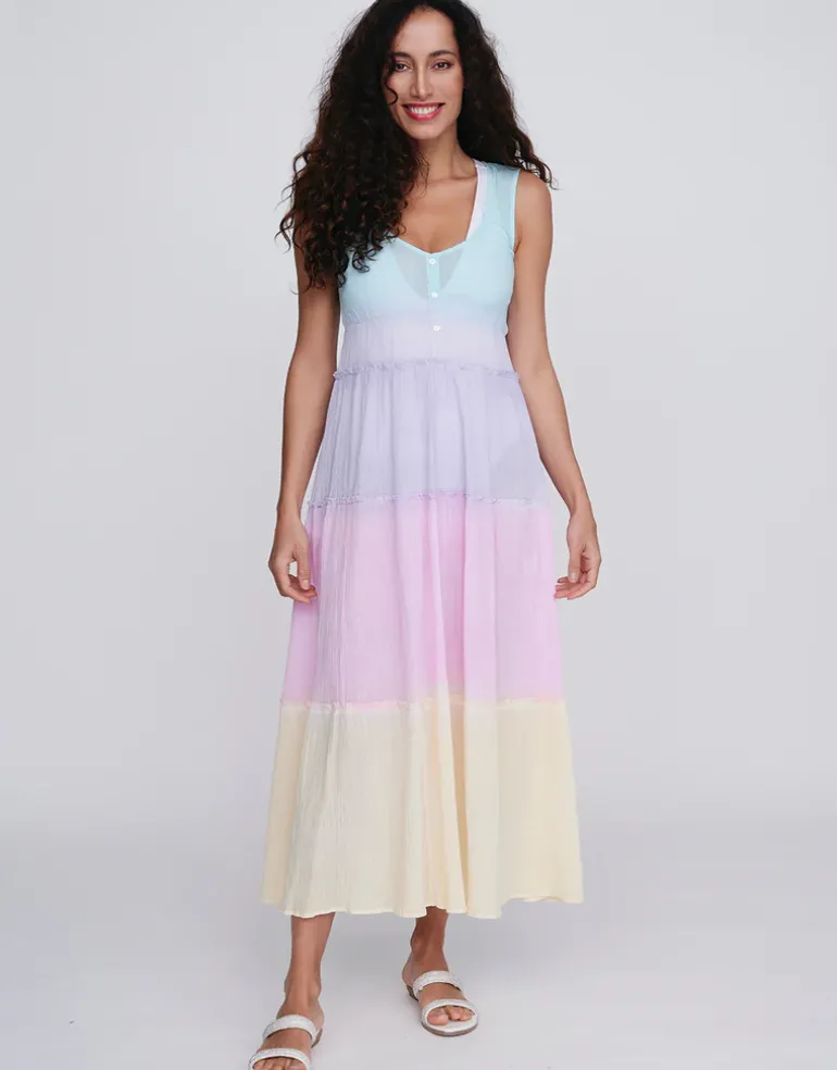 The Biarritz Maxi Dress from Pia Rossini is a lovely sleeveless, ankle length dress in pastel shades with a rounded neckline and a tiered skirt.