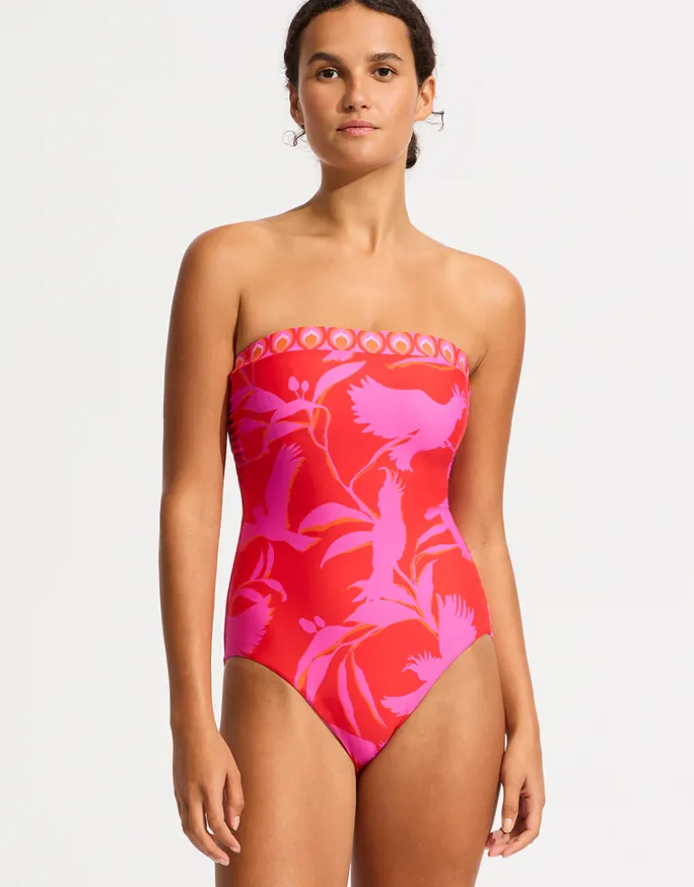 The Birds of Paradise DD Bandeau swimsuit from Seafolly is a lovely supportive style in this gorgeous pink and red bird print. With hidden underwire, gripper tape, internal shelf bra and an optional adjustable strap for extra support.