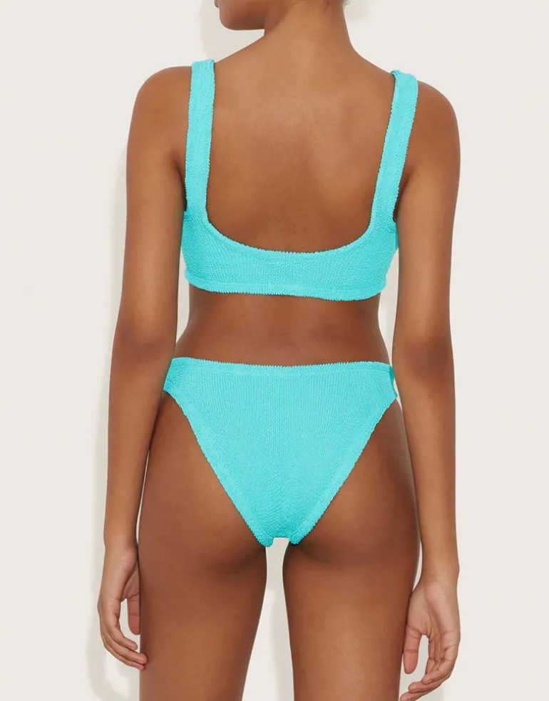 The Bonnie bikini set from Hunza G in Aqua is a crop top style with a flattering top that gathers into a bow in the centre with wide, comfortable straps. The bikini pant has a deeper waist band than their regular briefs with a high cut leg offering minimal coverage.