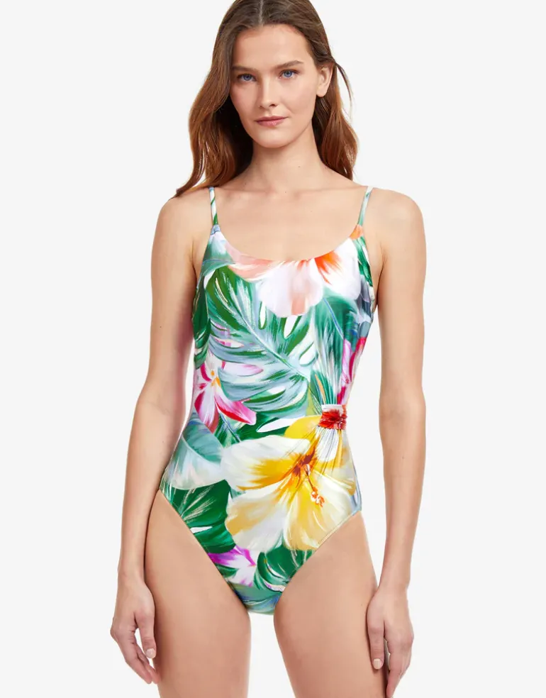 The Bora Bora Round Neck swimsuit from Gottex is a bright and beautiful tropical floral print style with a round neck, narrow adjustable straps, soft padded cups and a low back.