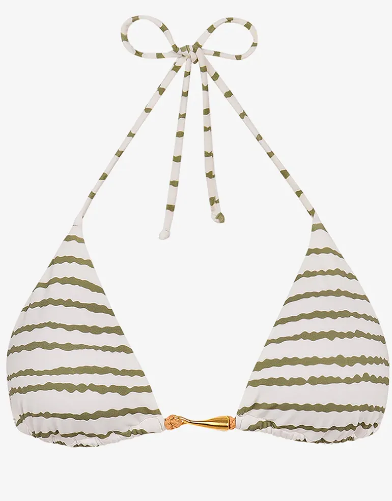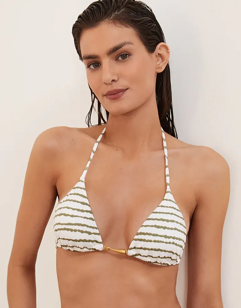 The Borea Mandy Tri bikini top from ViX is an adjustable triangle bikini top featuring an elastic cord and metal detail at the centre front. It comes with ties for a customized fit around the neck and back, and the added convenience of removable padded cups.