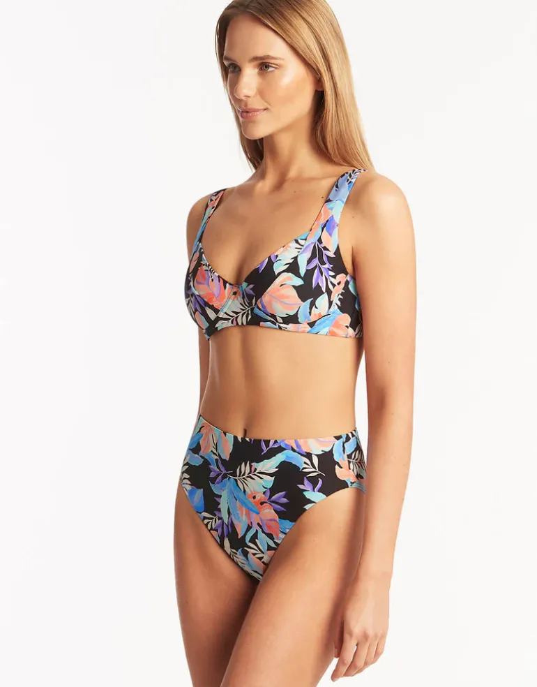 The Botanica Retro High Waist bikini pant from Sea Level Australia is a multicoloured floral on black base high-waist pant with full coverage.