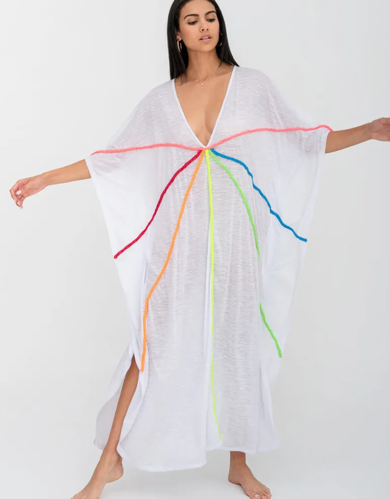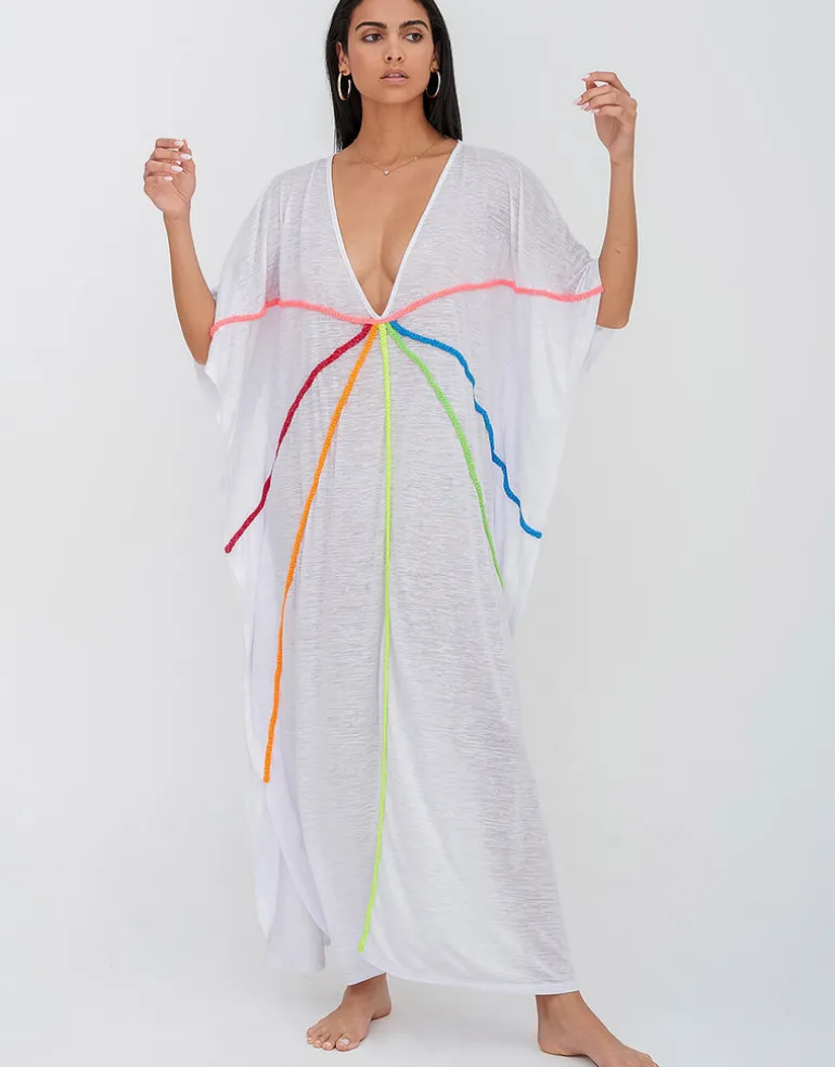 The lovely Braided Front Kaftan from Pitusa in lightweight white burnout fabric features dropped sleeves, a deep V-neckline and a burst of colorful braided strands throughout the flowing bodice.