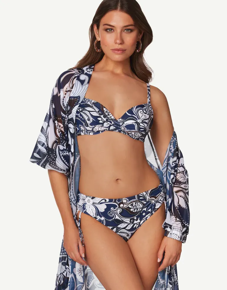 The Cachemire Underwired bikini set from Roidal is a bra-style bikini top with wrap front underwired cups, a clipback and adjustable straps and an adjustable side bikini pant with good coverage.