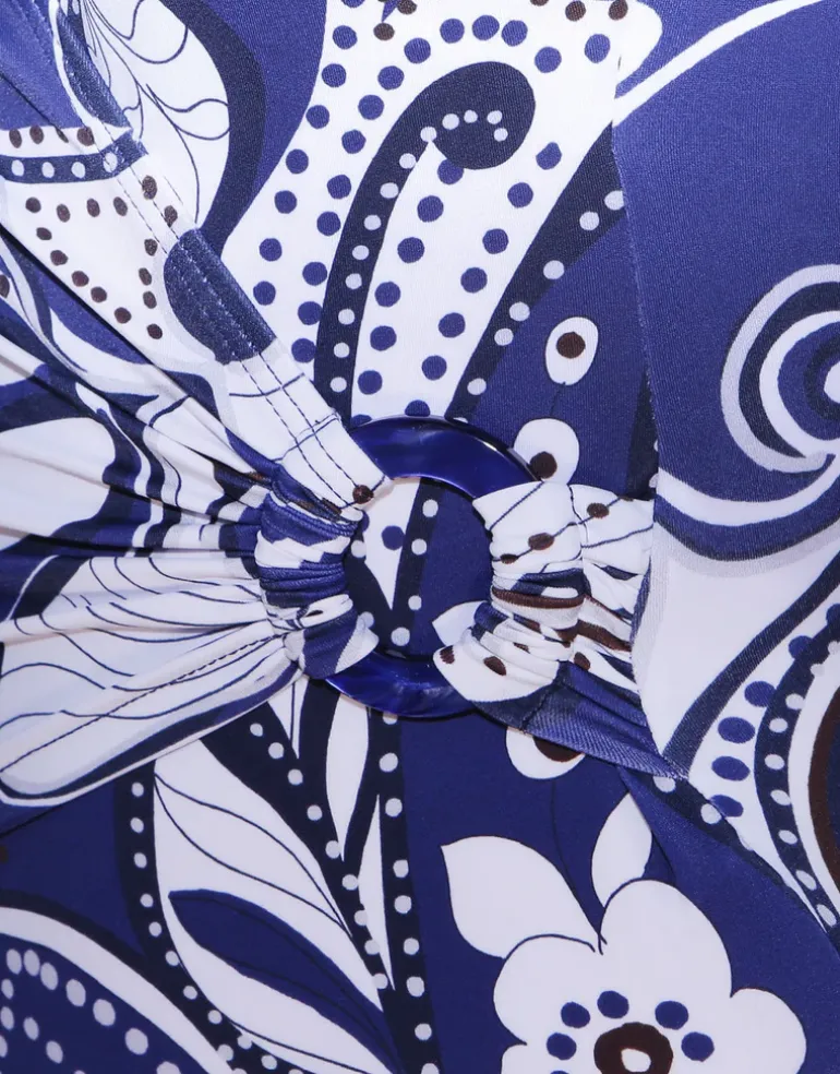 The stunning Cachemire Wrap Front swimsuit from Roidal is a beautiful blue and white print style with soft cups and a crossover front coming together in a ring detail to the side.