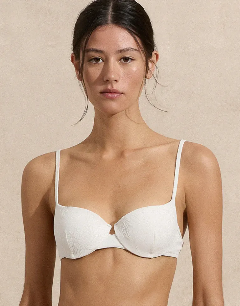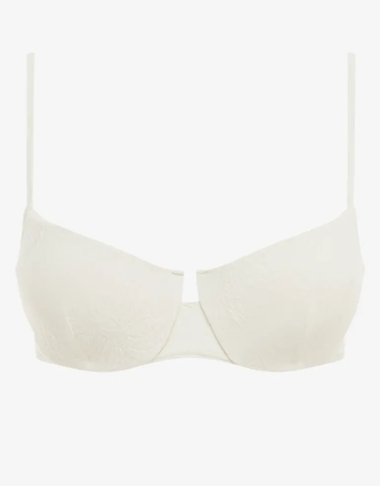 The Camelia Forever Balconette bikini top from Peony is beautiful white textured jacquard floral fabric in a pretty balconette style with underwire, soft removable padding, a multifit back closure and narrow adjustable straps for comfort and support.
