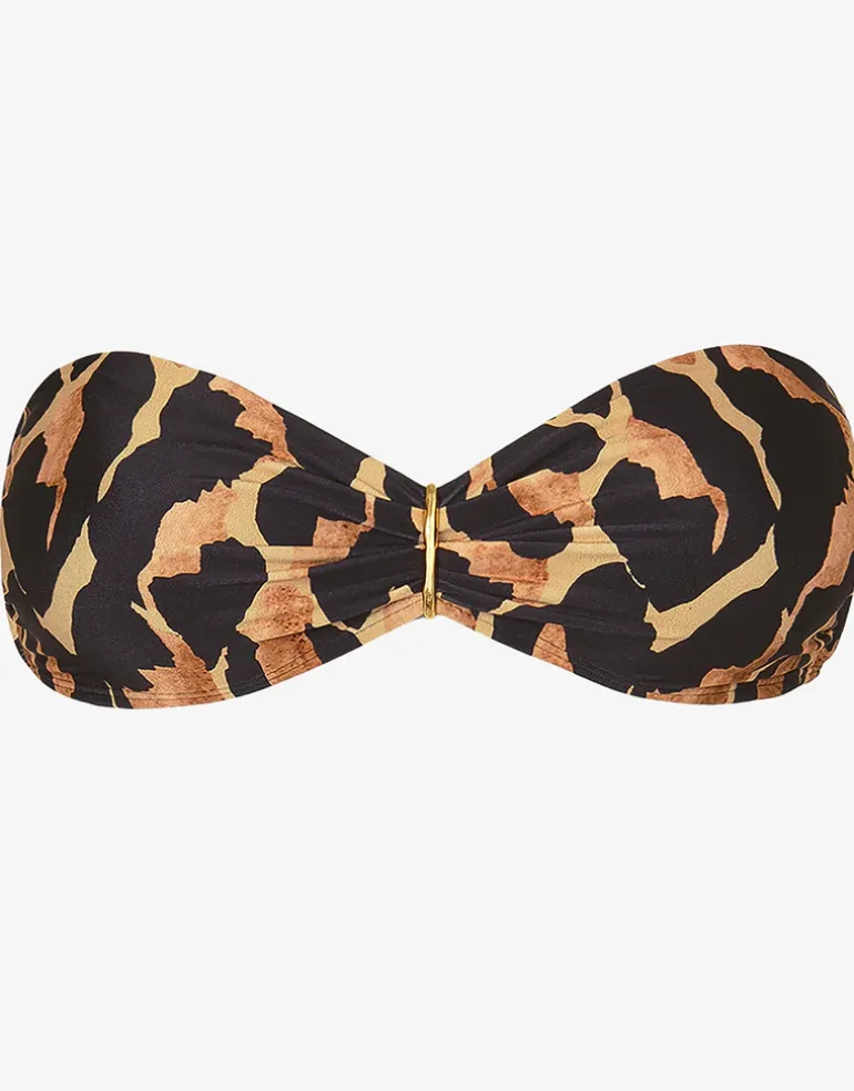 The Camu Serena Bandeau bikini top from ViX stands out in this beautiful warm animal print with a gold metal bar highlight at the center bust. This eye-catching design transforms the ordinary into the extraordinary, with removable padding, back clip and optional straps to achieve the perfect fit.
