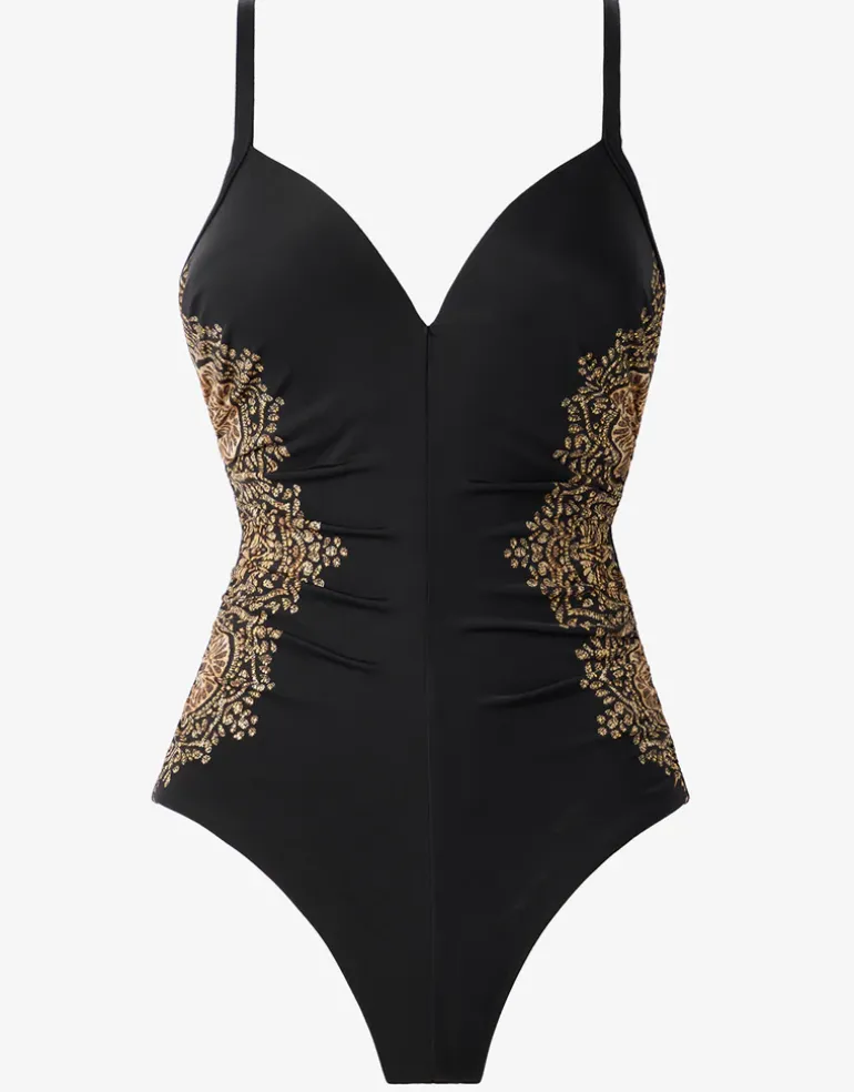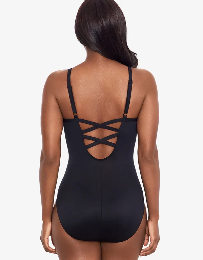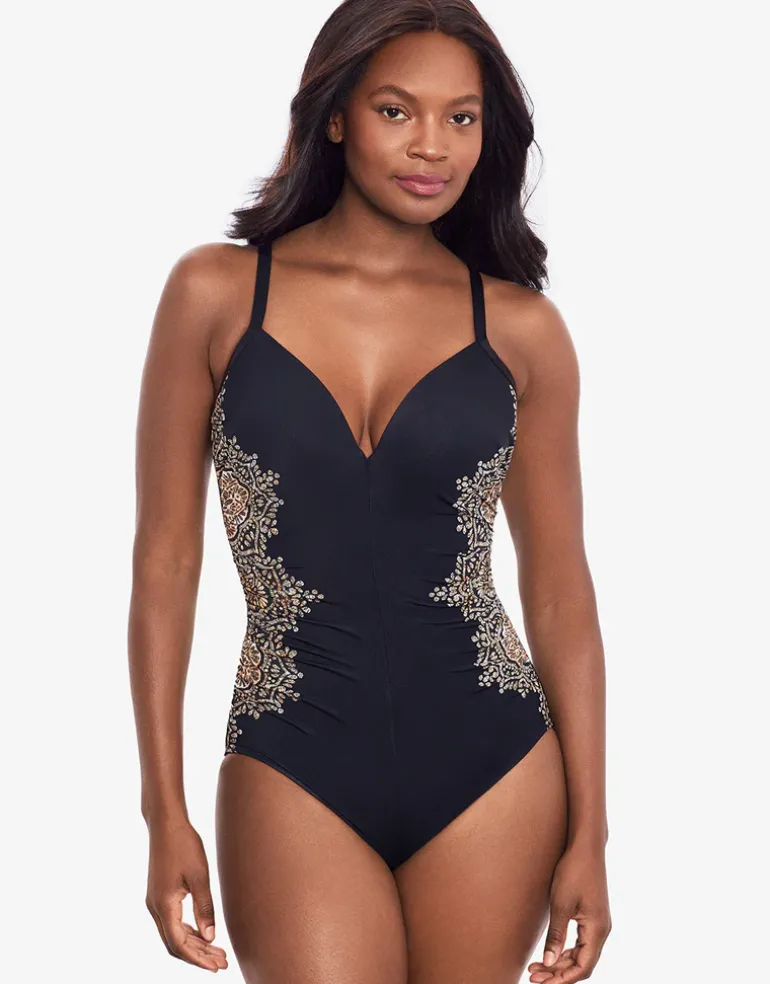The Temptation swimsuit from Miraclesuit is not only made from the fantastic Miratex shaping fabric, but is also designed to slim the silhouette and accentuate the curves. This beautiful Cappadocia version in black with gold detailing at the sides has narrow adjustable straps, criss-cross back detailing and soft foam cups.
