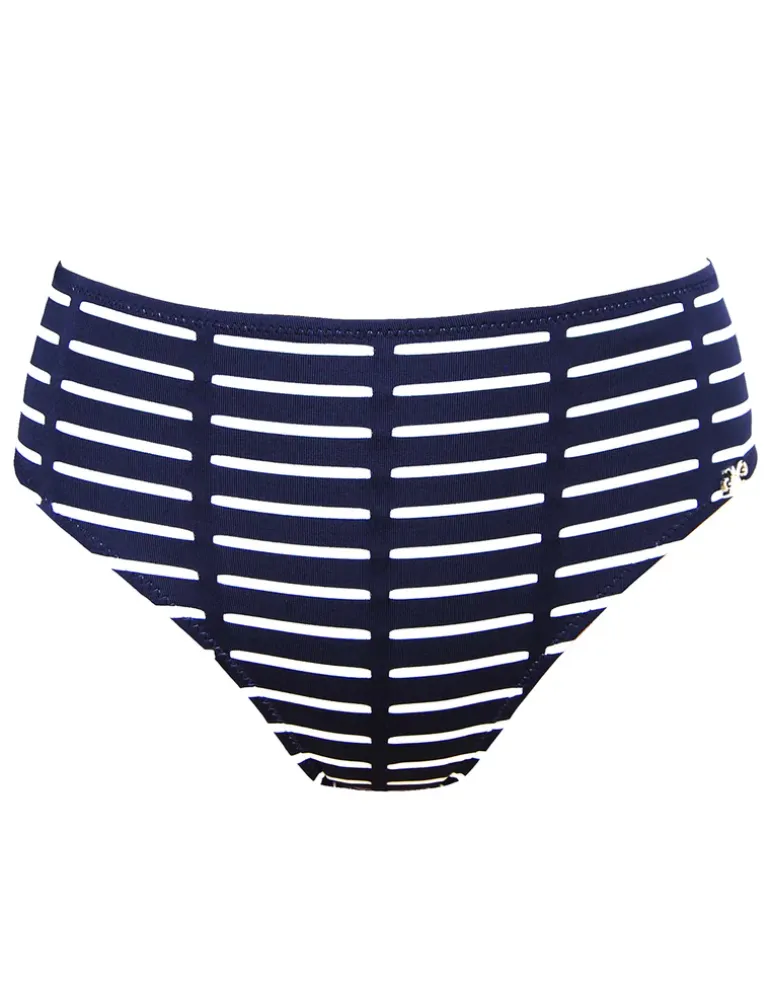 The Capri Maxi Control bikini pant from Nuria Ferrer is a lovely dark blue and white slimming stripe design in a deep, full coverage pant with added tummy control.