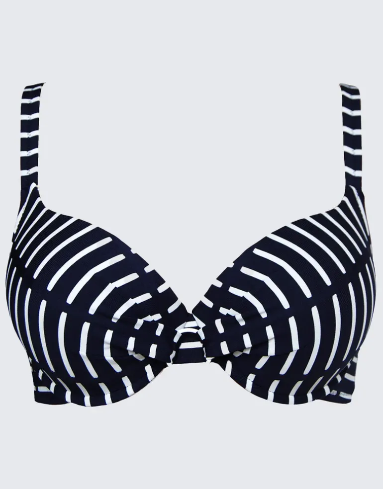 The Capri Plunge Bikini top from Nuria Ferrer is a lovely optical stripe design in blue and white, with soft moulded cups, underwire, a clipback and adjustable straps. With a ring detail at the centre front, this is a supportive style which gives a great shape.