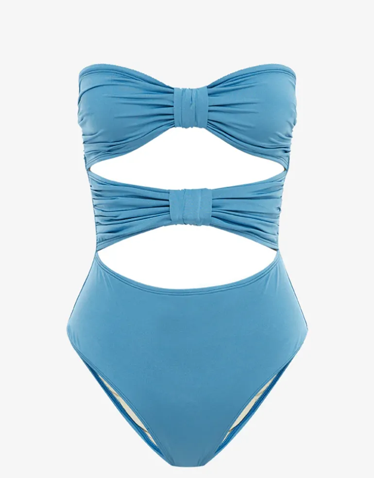The Capri Ruched Holiday One Piece swimsuit from Peony is a beautiful blue, cut out style with a double ruched bandeau front detail, removable cups and a clip at the back.