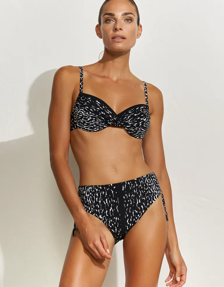 The Capture Adjustable bikini pant from Maryan Mehlhorn is a beautiful bikini pant in black and white print with full rear coverage and ties to adjust the leg height.