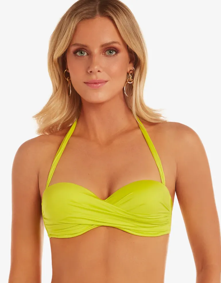 The Ceylan Twist Bandeau bikini top from Roidal in a beautifully bright lime green is an underwired, bandeau style with a beautiful central twist, moulded cups and an optional halter strap.