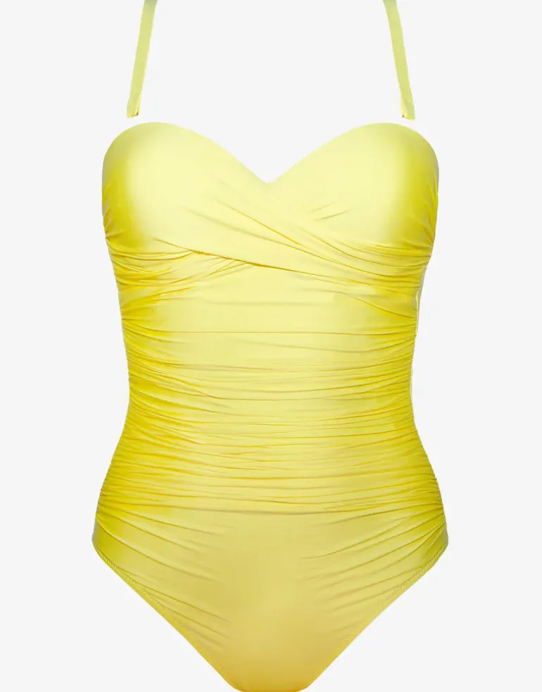The Ceylan Underwired Twist Bandeau swimsuit from Roidal is a beautiful Mimosa yellow twist bandeau style with optional adjustable straps. With ruching across the tummy and underwired moulded cups for great shape and support.
