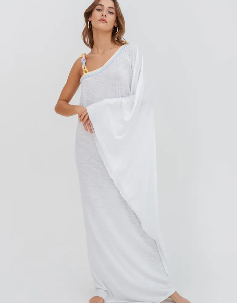 The amazing Chain One Shoulder Maxi dress from Pitusa is a maxi-length dress in a one-shoulder style with a full-length angel wing sleeve to one side and finished with Inca weave trim to the neckline and a gorgeous knitted chunky chain detail strap.
