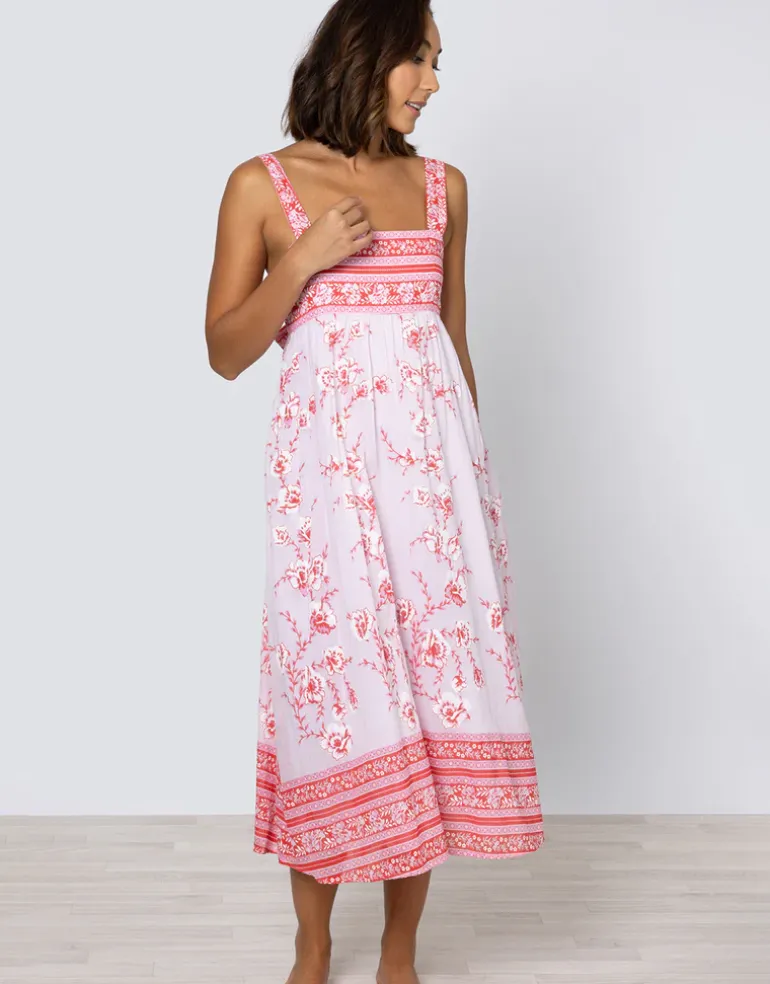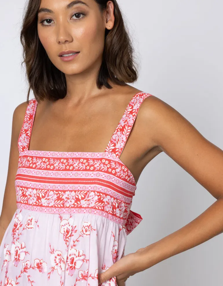 The Cherry Blossom Tie Back dress from Juliet Dunn is a beautiful rose pink and red midi dress with hand printed red florals. With a bandeau bodice finished with a pretty bow at the back, full skirt, and wide straps.