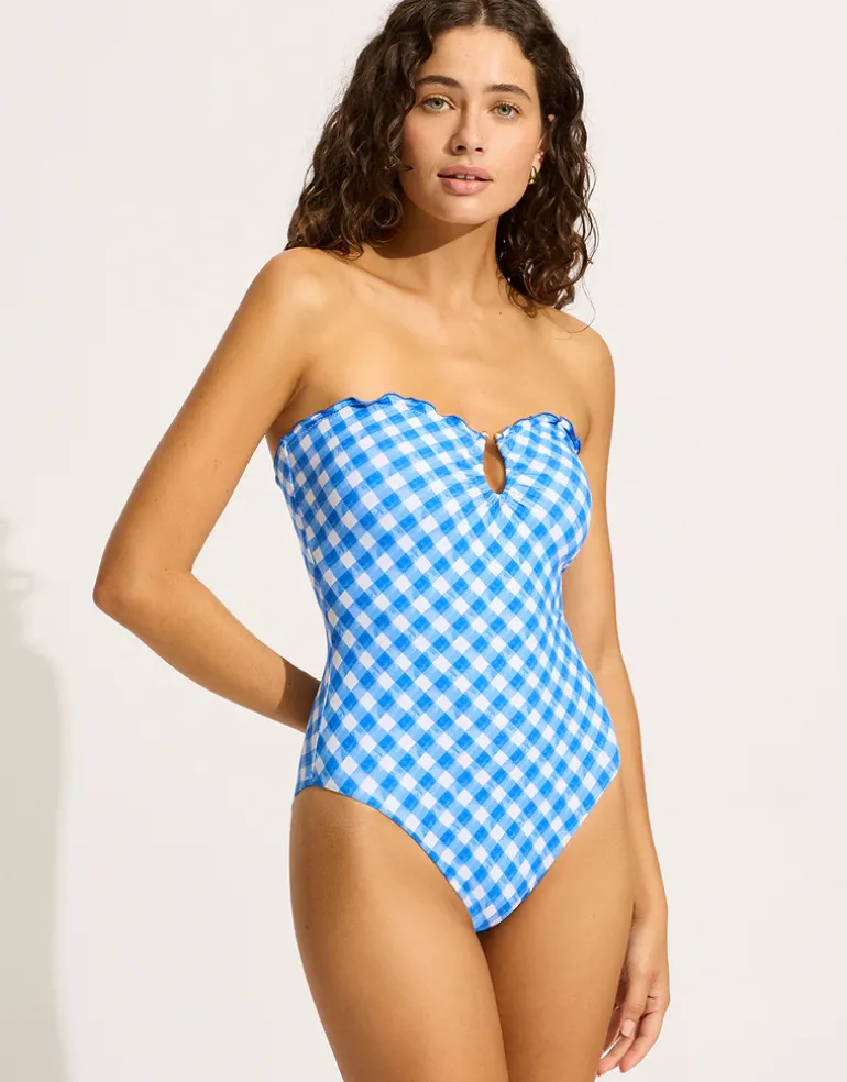 The Ciao Bella Bandeau swimsuit from Seafolly in timeless Azure gingham print is a high leg bandeau style swimsuit with decorative ring detail on the front and optional halter style neck tie. Removable cups, gripper tape and side boning offers plenty of support to this Sicilian inspired piece.