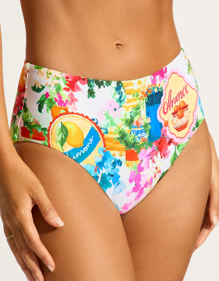 The Ciao Bella High Waisted bikini pant from Seafolly is a vibrant multicoloured floral print on a white backdrop inspired by the zest of Mediterranean life. This bikini pant is a high waisted style that offers full rear coverage.