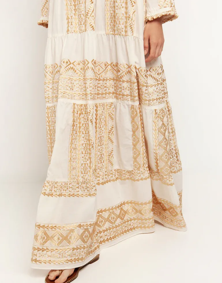 The Classic Triangle Maxi dress from Greek Archaic Kori is an exquisite tiered dress featuring a plunging V-neckline and graceful long sleeves. Crafted from natural-toned fabric, it is lavishly embellished with triangle gold embroidery and meticulous stitching, adding an air of luxury and sophistication throughout.