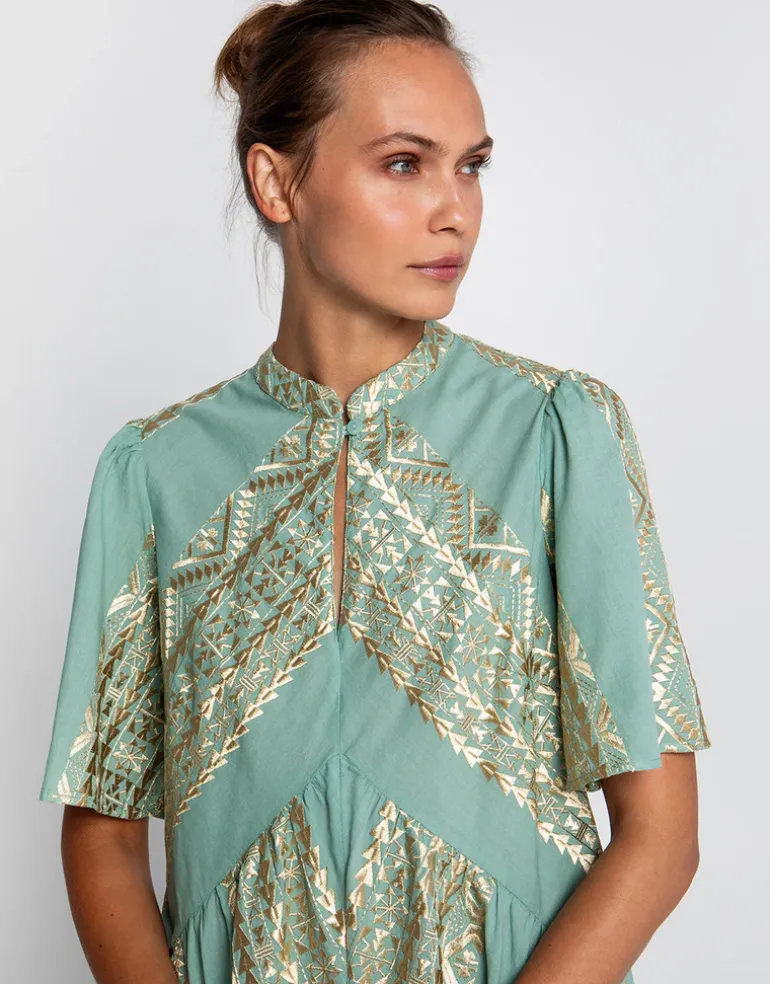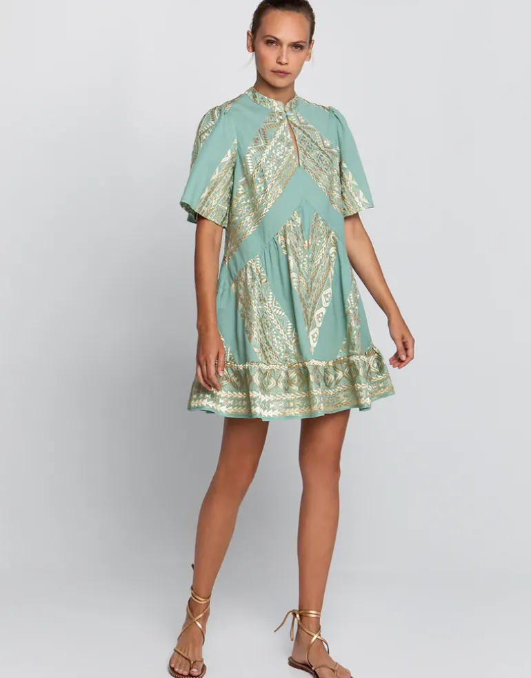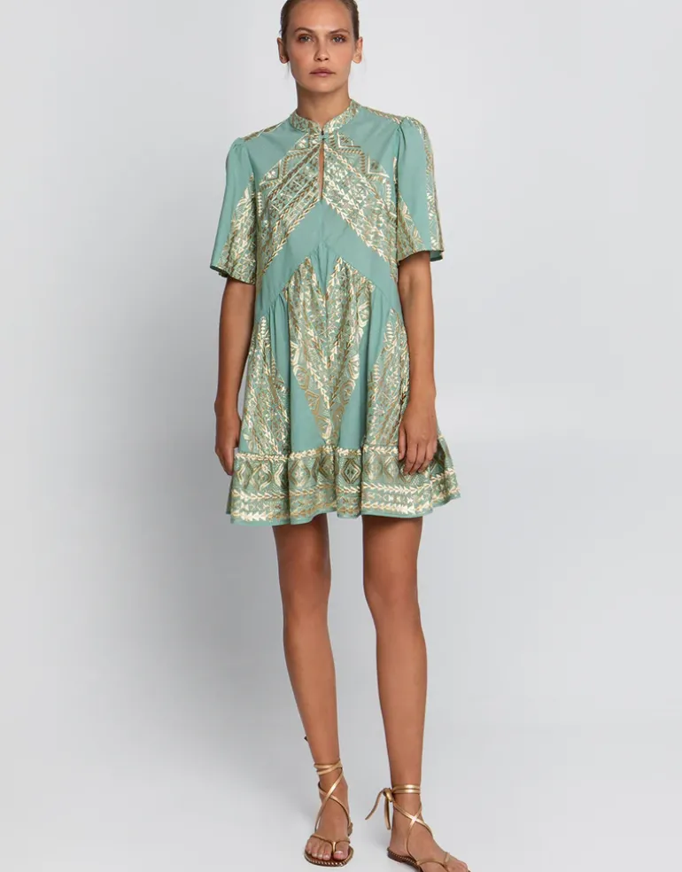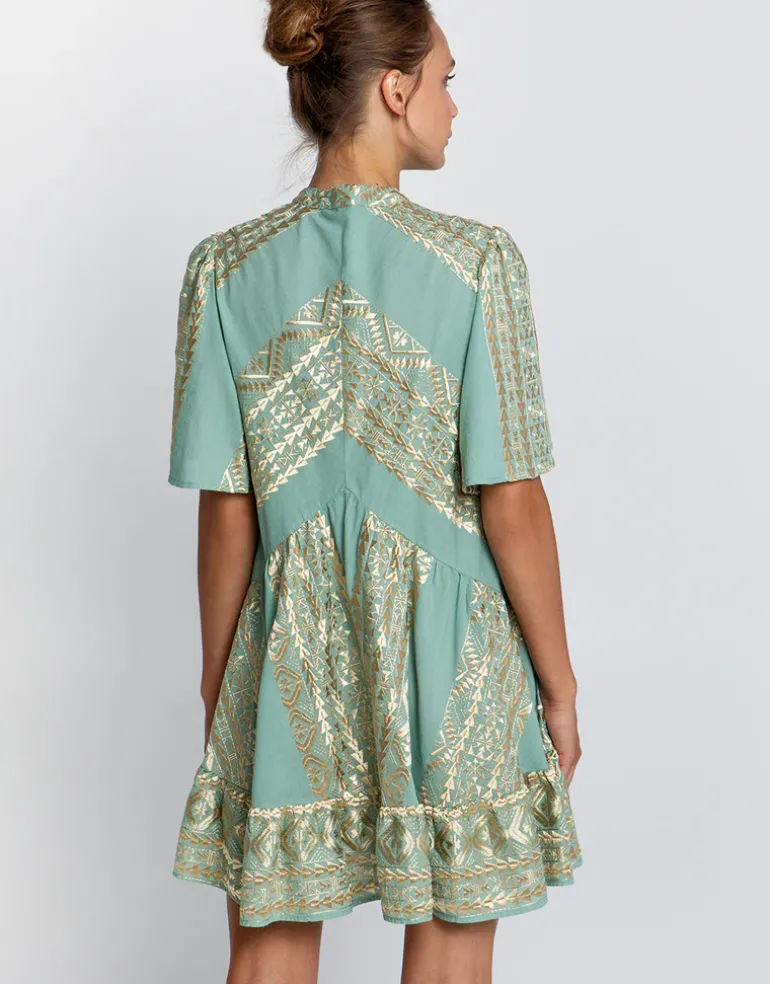 The Classic Triangle Oriental Style Mini dress from Greek Archaic Kori is a mini dress featuring a high, oriental-style neckline with a buttoned collar and cut-out detail beneath. Designed with half sleeves, a diagonal shaped waistline, and gentle gathering below. Crafted in a beautiful sea green cotton and embellished with intricate gold feather embroidery.