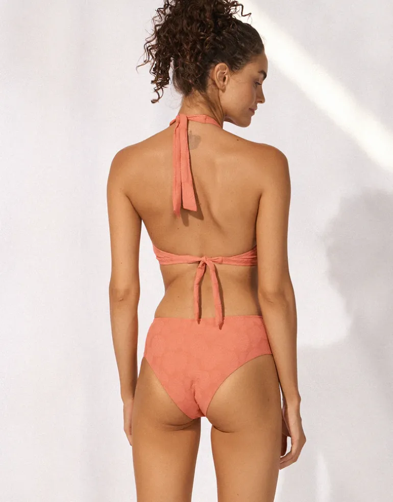 The Coastal Daydream High Rise bikini pant from Watercult in lovely coral red, is a high rise style with a cheeky cut for moderate rear coverage.