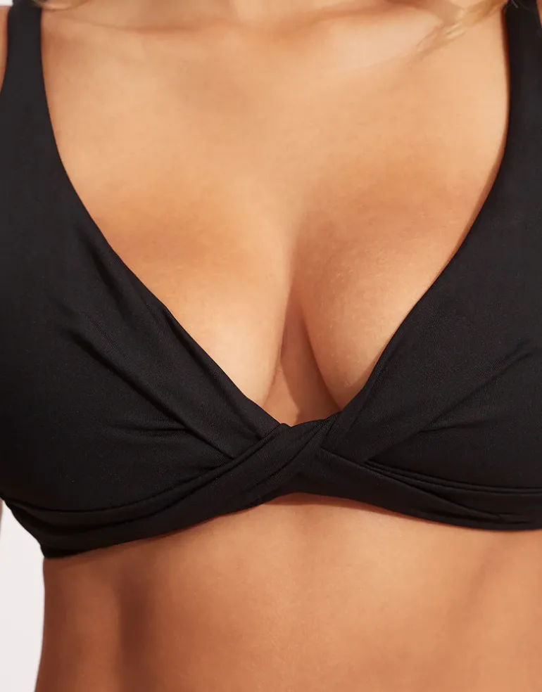 The DD Double Wrap Front bikini top from Seafolly’s Collective range is a lovely style for fuller busts. With side boning and soft moulded cups for shape and support, the back straps are adjustable and convertible so they can be worn straight over the shoulder or crossed at the back to give a halter look. There is also a multi-fit clip at the back so you can adjust the fit around the back too.